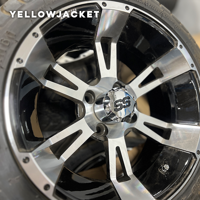 These golf cart rims are mean. hence the name, Yellowjacket. Much like their namesake, these rims are unapologetically themselves and take what they want. In this image they have a low-profile tire mounted to them and would fit your standard height golf cart. Look closer at how they are inset and give the rim a larger look.